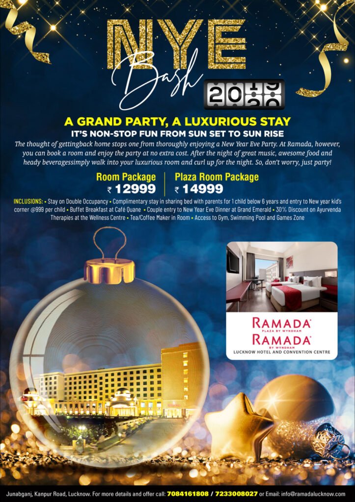 The New Year Eve 2020 Room Package Offer is for 2D/1N at Ramada Lucknow for a couple for just Rs 12,999/- (plus GST), and Rs 14,999/- (plus GST) for Ramada Plaza Lucknow. This package is valid for 31 Dec 2019 only.